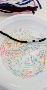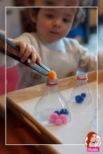 הכנסת פונפונים לפתח בקבוק בעזרת מלקחיים –